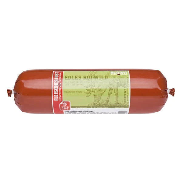 80% Rotwild (70% Fleisch vom Rotwild, 15% Herz vom Rotwild, 10% Lunge vom Rotwild, 5% Leber vom Rotwild), 10% Kartoffeln, 5% Pastinaken, 3% Waldbeeren, 2% Eierschalenpulver