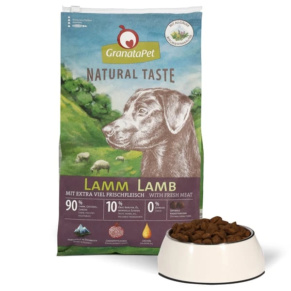 Lamm und Geflügel 70 % (frisches Lammfleisch 30 %, frisches Geflügelfleisch 20 %, Geflügelfleisch getrocknet und fein vermahlen 10 %, Lammfleisch getrocknet und fein vermahlen 7 %, Geflügelfett 3 %), Gemüse 20 % (Kartoffelflocken, Spinat, Karotten), Granatapfelkerne 4 % (getrocknet und fein vermahlen), Lachsöl 2 %, Mineralstoffe 1,5 %, Vitamine 0,5 %, Allgäuer Bergwiesenkräuter 0,5 % (Bockshornklee, Breitwegerich, Spitzwegerich, Kamille, Löwenzahn, Ringelblume), Chicoree 0,5 % (fein vermahlen, mit natürlichen FOS und Inulin), Kräuter 0,3 % (Pfefferminze, Thymian, Oregano, Salbei, Petersilie, Majoran, Anissamen), Früchte 0,3 % (Cranberrys, Heidelbeeren, Äpfel), Algen 0,2 % (Spirulina, Knotentang), neuseeländische Grünlippmuschel 0,1 % (fein vermahlen, von Natur aus reich an Glucosamin und Chondroitin), Yucca schidigera 0,1 %