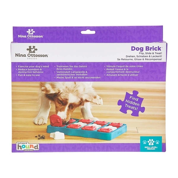 Das Hunde-Denkspielzeug Dog Brick mit Level 2 von Nina Ottosson by Outward Hound wird deinen Hund stundenlang beschäftigen, da er seine natürlichen Jagdinstinkte ausleben kann, um die verdeckten Leckerlis aufzuspüren. Das Spielzeug hat drei einfach befüllbare Fächer, in denen die Lieblingsleckerlis und -snacks deines Hundes versteckt werden können. Die Teile mit aufklappbarem Deckel lassen sich öffnen und beherbergen das erste Fach zum Verstecken der Leckerlis. Sie können auch verschoben werden, sodass das zweite Fach darunter aufgedeckt wird. Die weißen hohlen Teile in Knochen-Form beherbergen das dritte Fach und lassen sich problemlos herausnehmen, um leckere Snacks zu verstecken. Dieses Denkspielzeug ist ideal für Welpen, die schon Level 1 der Spielzeug-Linie von Nina Ottosson gemeistert haben und bereit für die nächste Stufe sind. Hergestellt aus robusten und herausnehmbaren Kunststoffteilen und lebensmittelechten Materialien, die frei von BPA, PVC und Phthalaten sind. Reinigung von Hand mit Spülmittel und Wasser.