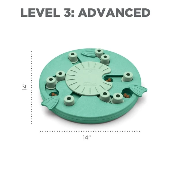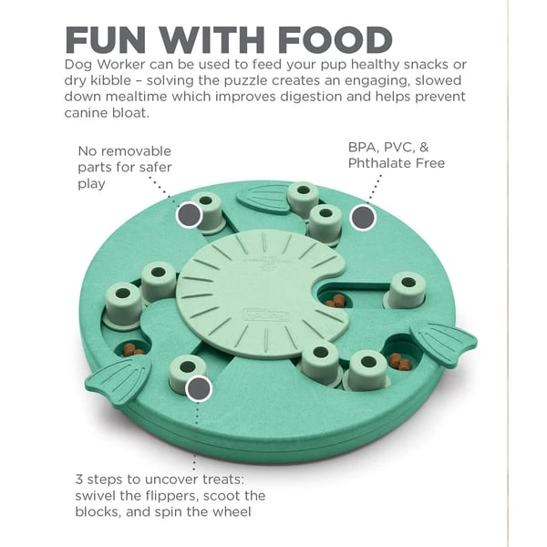 Das Hundespielzeug Dog Worker von Nina Ottosson by Outward Hound ist ein anspruchsvolles Denkspielzeug mit Level 3, das deinen Hund stundenlang beschäftigen wird, da er bei der Suche nach den versteckten Leckerlis seine Instinkte ausleben kann. Bei diesem interaktiven Hunde-Denkspielzeug für Fortgeschrittene muss dein Hund drei Schritte erlernen, um an seine leckeren Belohnungen zu gelangen: die Flossen drehen, die Blöcke verschieben und das Rad in der Mitte drehen. Die verdeckten Fächer befinden sich unter den Flossen und unter dem Rad in der Mitte.