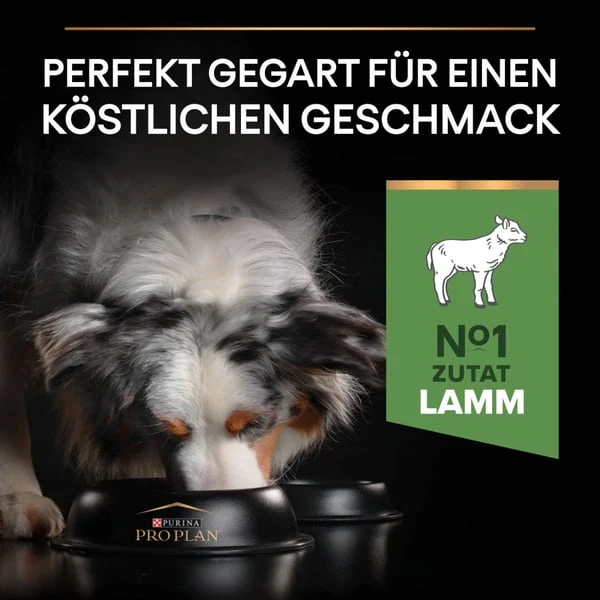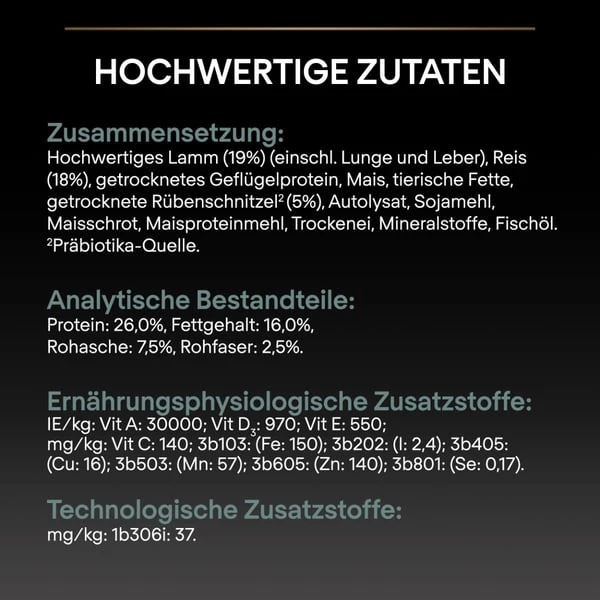 Hochwertiges Lamm (19%) (einschl. Lunge und Leber), Reis (18%), getrocknetes Geflügelprotein, Mais, tierische Fette, getrocknete Rübenschnitzel2 (5%), Autolysat, Sojamehl, Maisschrot, Maisproteinmehl, Trockenei, Mineralstoffe, Fischöl. 2Präbiotika-Quelle.
